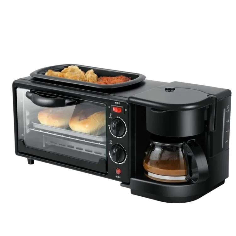 - A compact breakfast station that combines a toaster oven, coffee maker, and a frying pan, perfect for making a full meal in one appliance.