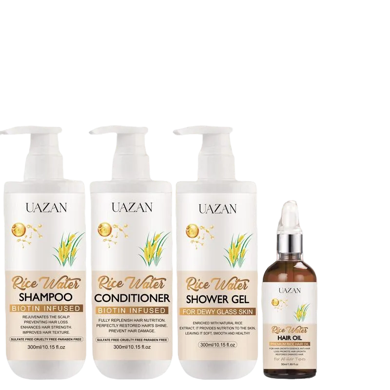 Embrace the revitalizing power of rice water with the complete UAZAN Rice Water & Biotin collection. This comprehensive set includes a shampoo, conditioner, shower gel, and hair oil, all crafted to be sulfate-free, cruelty-free, and paraben-free. The Biotin-infused shampoo and conditioner work together to rejuvenate the scalp, prevent hair loss, and fully replenish your hair’s natural nutrition. They actively enhance hair strength and improve texture, while the hair oil provides a premium finish. The Rice Water Shower Gel is enriched with natural rice extract to provide nutrition for the skin, leaving it with a soft, smooth, and healthy “dewy glass skin” feel.